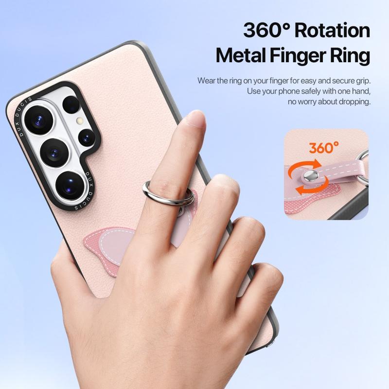 De geïntegreerde metalen vingerring draait 360° vrij rond, voor veilig gebruik met één hand. Het verbetert de stabiliteit van de grip, vermindert het risico van per ongeluk vallen en kan ook functioneren als een handige standaard voor handsfree kijken.