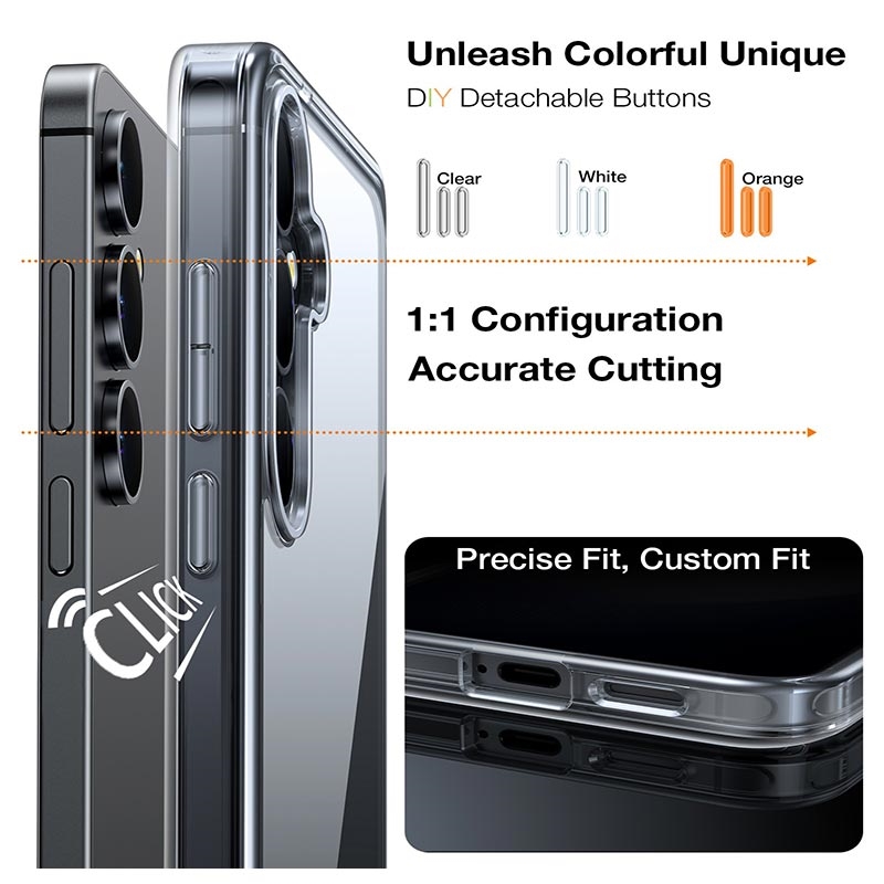De case bevat drie verwisselbare kleurensets voor knoppen, zodat je het uiterlijk van je Samsung Galaxy S26 kunt personaliseren. Verwissel eenvoudig knoppen die bij je stijl, outfit of stemming passen en creëer een uniek, aangepast uiterlijk.