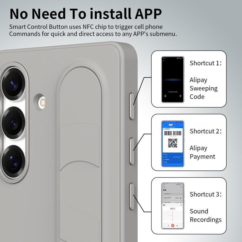 Deze slimme hybride hoes is uitgerust met drie intelligente NFC-knoppen waarmee je met één druk op de knop snel toegang krijgt tot apps als Camera, Zaklamp of Screenshot. Niet opladen, geen extra apps - gewoon eenvoudige, directe functionaliteit.