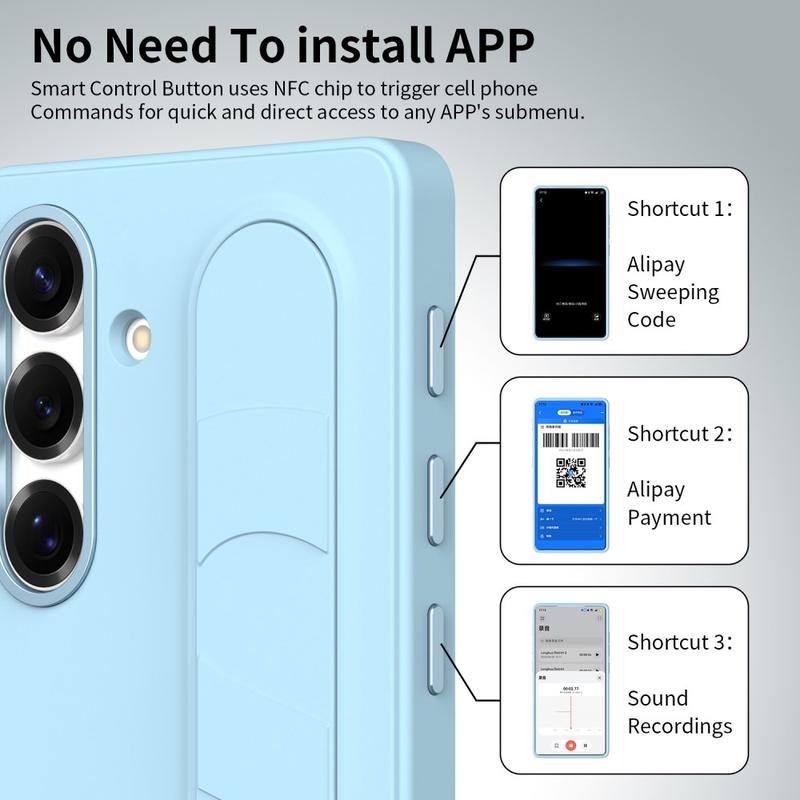 Deze slimme hybride hoes is uitgerust met drie intelligente NFC-knoppen waarmee je met één druk op de knop snel toegang krijgt tot apps als Camera, Zaklamp of Screenshot. Niet opladen, geen extra apps - gewoon eenvoudige, directe functionaliteit.