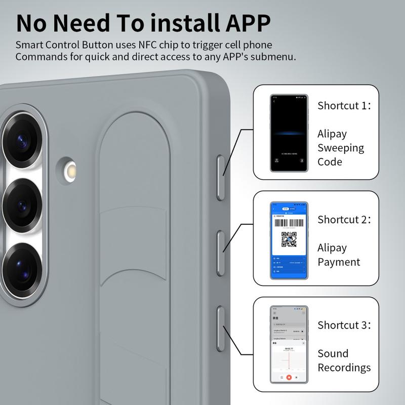 Deze slimme hybride hoes is uitgerust met drie intelligente NFC-knoppen waarmee je met één druk op de knop snel toegang krijgt tot apps als Camera, Zaklamp of Screenshot. Niet opladen, geen extra apps - gewoon eenvoudige, directe functionaliteit.