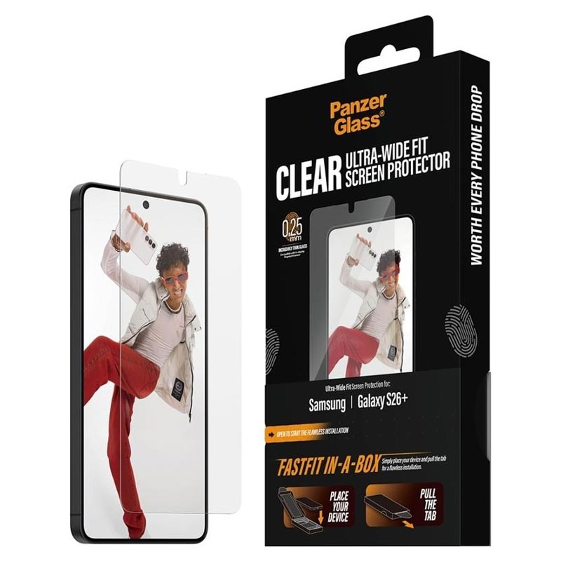 De PanzerGlass Ultra-Wide Fit Screen Protector voor Samsung Galaxy S26+ is ontworpen voor snelle, bubble-free installatie dankzij het innovatieve FASTFIT IN-A-BOX systeem. Plaats je Samsung Galaxy S26+ gewoon met de voorkant naar boven, trek aan het lipje en geniet elke keer van een perfect uitgelijnde protector - geen stof, geen frustratie.