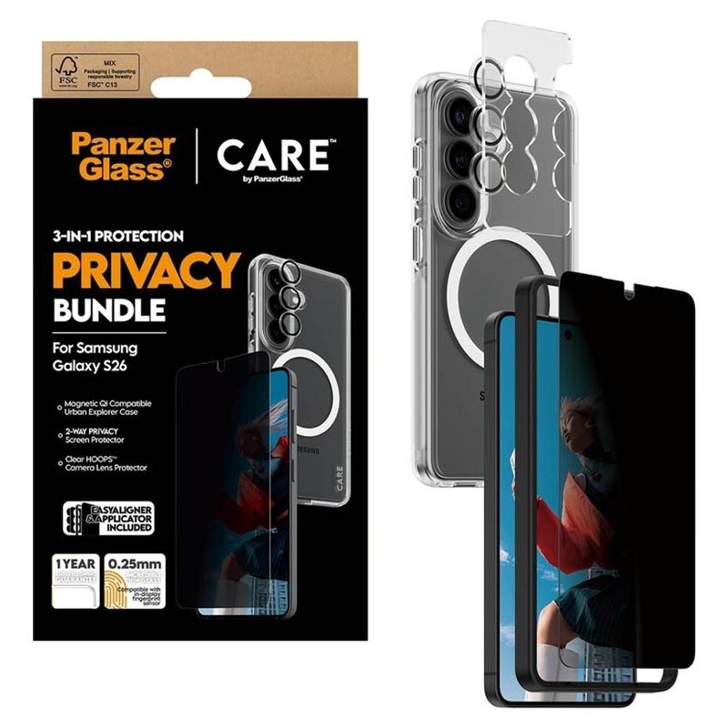 Care by PanzerGlass 3-in-1 Privacybundel voor Samsung Galaxy S26 - Privacyschermbeschermer, Hoops-lensbeschermer, CARE Urban Combat-hoesje (3,6 m), EasyAligner