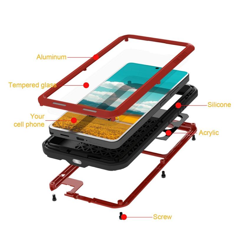 De Love Mei serie is geïnspireerd door militaire en industriële techniek, waarbij gebruik wordt gemaakt van meerlaagse bescherming met metalen frames en siliconen demping - een structuur die bestand is tegen vallen van meer dan 2 meter met behoud van touchscreen gevoeligheid.