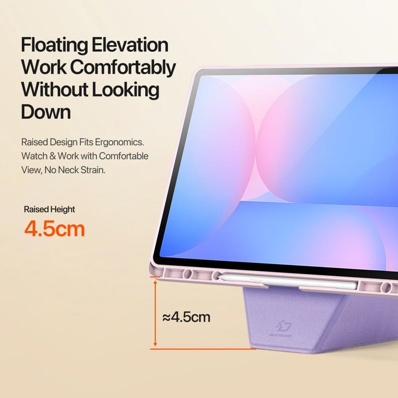 Maak van je Samsung Galaxy Tab S10 FE+ een echt veelzijdig werkstation. De DUX DUCIS Vers Series hoes tilt de tablet met ongeveer 4,5 cm op zodat je hem zonder spanning kunt bekijken, beschermt hem tegen de dagelijkse stoten en past in elke tas dankzij de vederlichte constructie. Van binge-watching tot schetsen, deze opvouwbare hoes past zich in enkele seconden aan.