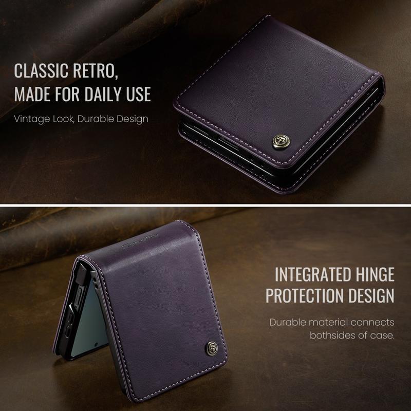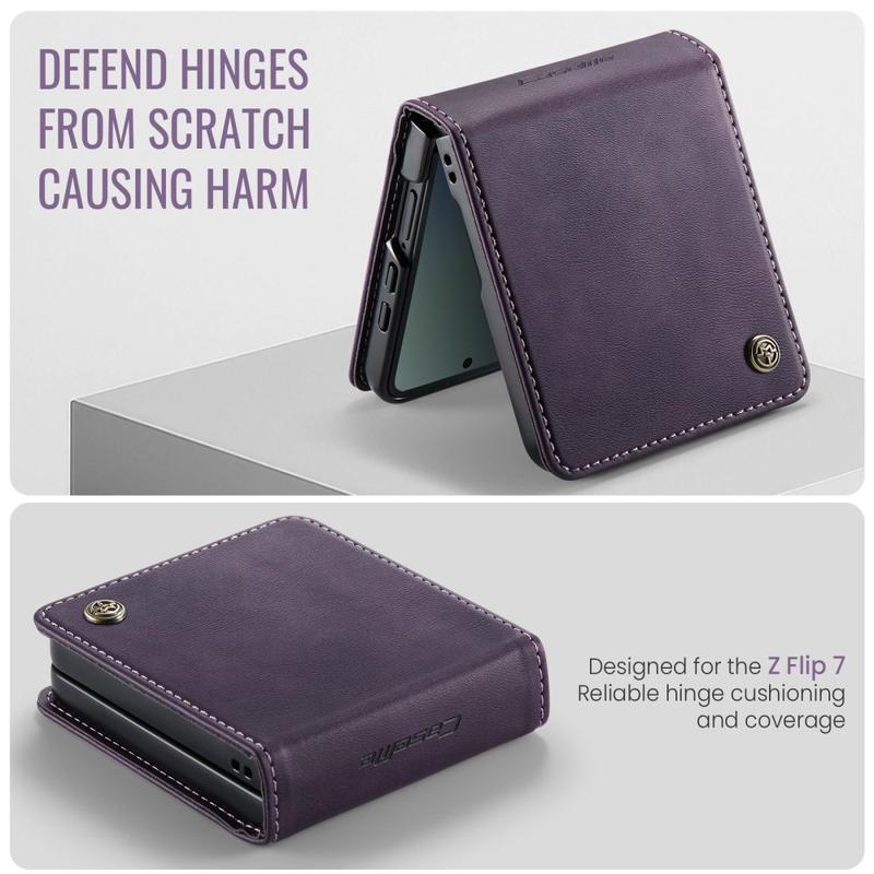 Het CASEME 033 Serie Portemonneehoesje voor de Samsung Galaxy Z Flip7 is gemaakt van kalfsleer polyurethaan gecombineerd met TPU. Het biedt volledige bescherming tegen krassen, stoten en dagelijks gebruik, terwijl het een premium, elegante uitstraling behoudt.