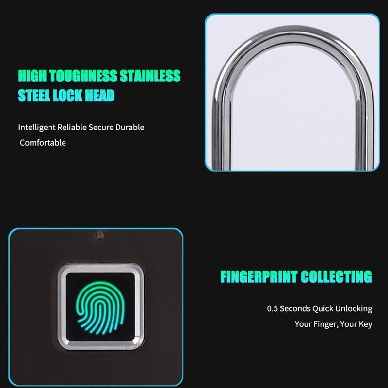 Dit minihangslot is gemaakt van een behuizing van zinklegering en een zeer sterke roestvrijstalen slotbeugel, en is ontworpen voor betrouwbaar dagelijks gebruik. Het kan tot 10 vingerafdrukken opslaan, inclusief die van de beheerder en gewone gebruikers, en de oplaadbare batterij biedt een lange stand-bytijd en kan gemakkelijk via USB worden opgeladen. Dankzij het compacte formaat is het gemakkelijk mee te nemen, terwijl het vingerafdruksysteem helpt om de veelvoorkomende problemen van verloren sleutels en vergeten codes te voorkomen.