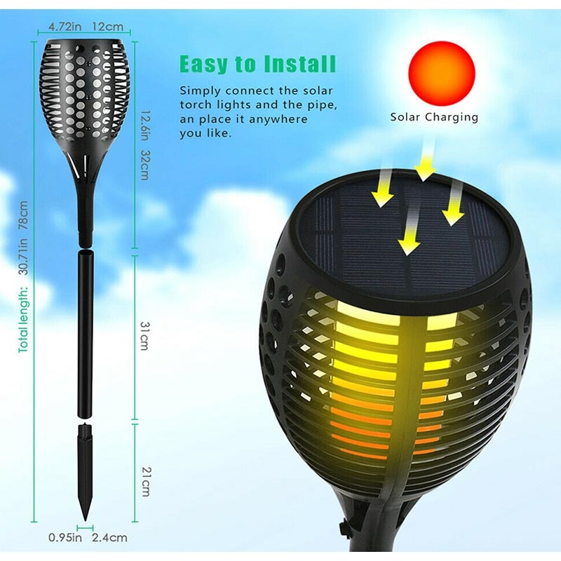 Deze Solar Stake Lights brengen warme, flikkerende vlameffecten naar je tuin, pad, terras of achtertuin. Met 96 LED's, oplaadtechnologie op zonne-energie en waterdichte constructie gaan ze 's nachts automatisch branden om een uitnodigende en decoratieve buitensfeer te creëren.