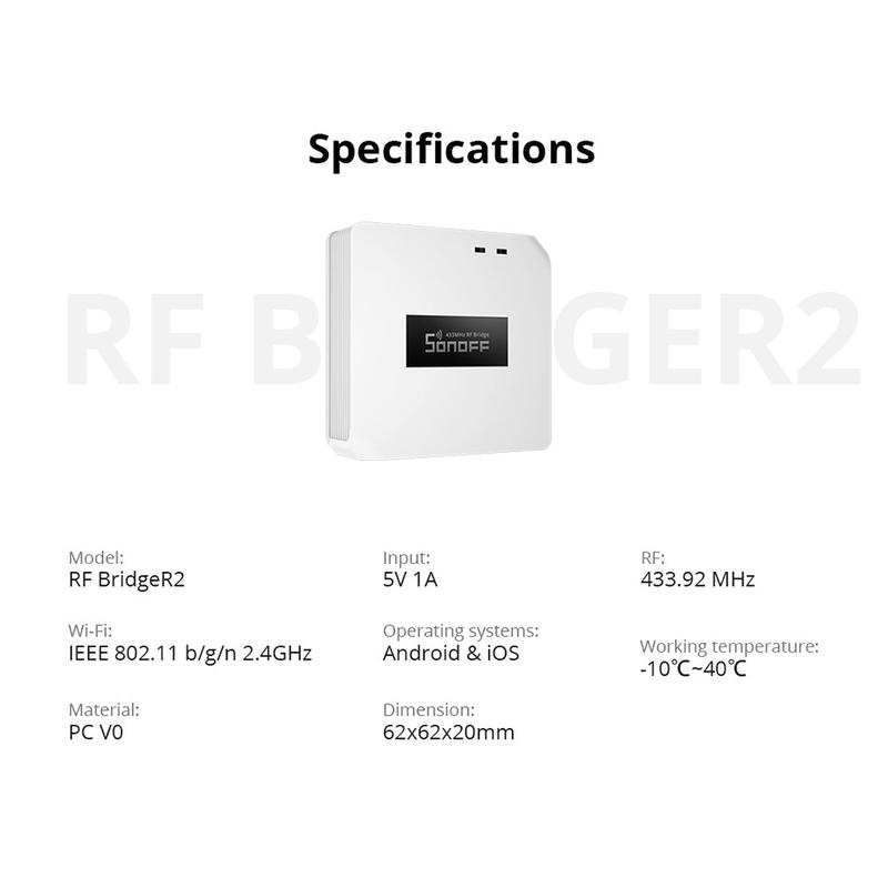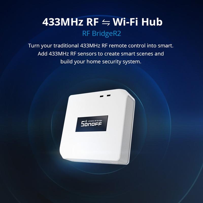 Breng uw 433MHz RF-apparaten naar uw WiFi-smart home met de Sonoff RF BridgeR2. Deze compacte slimme hub fungeert als een brug tussen RF 433,92 MHz-sensoren en afstandsbedieningen en uw WiFi-netwerk, zodat u compatibele apparaten vanaf uw telefoon kunt beheren via de eWeLink-app. Gebruik het om de bediening van meerdere RF-apparaten te vereenvoudigen, automatiseringsscènes te creëren en meldingen te ontvangen voor beveiligingsgebeurtenissen zoals het openen van deuren of bewegingsdetectie.
