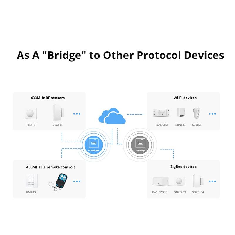 De RF BridgeR2 is een slimme upgrade als u al 433MHz RF-sensoren of afstandsbedieningen gebruikt en op zoek bent naar eenvoudigere bediening en automatisering. Het helpt RF-apparaten binnen de eWeLink-app te verenigen, ondersteunt scènes en meldingen voor beveiliging en voegt flexibiliteit toe met timers en delen. Een praktische manier om uw slimme huis uit te breiden zonder bestaande RF-apparatuur te vervangen.