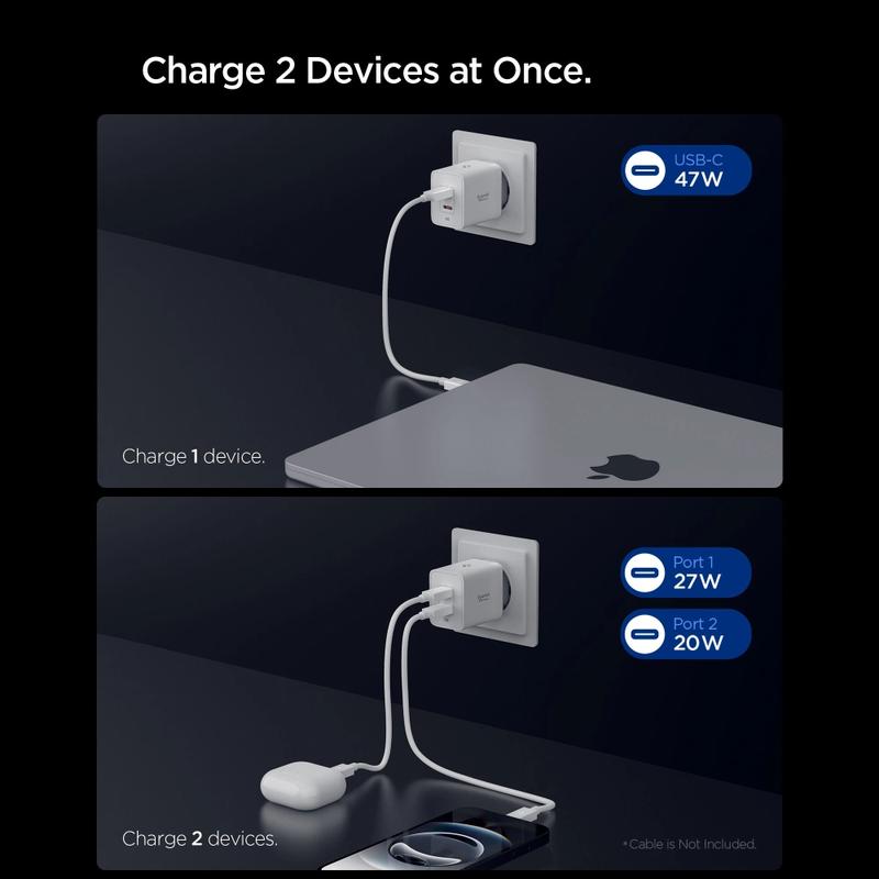 De Spigen Essential EE472EU is een krachtige en compacte GaN Pro-wandlader die is ontworpen om twee apparaten tegelijk snel op te laden met behoud van veilig, intelligent energiebeheer. Voorzien van dubbele USB-C poorten, past het automatisch de output aan, afhankelijk van het aantal aangesloten apparaten: een enkel apparaat kan de volledige 47W van USB-C(1) gebruiken, terwijl twee aangesloten apparaten een efficiënte gedeelde output van 27W + 20W ontvangen.