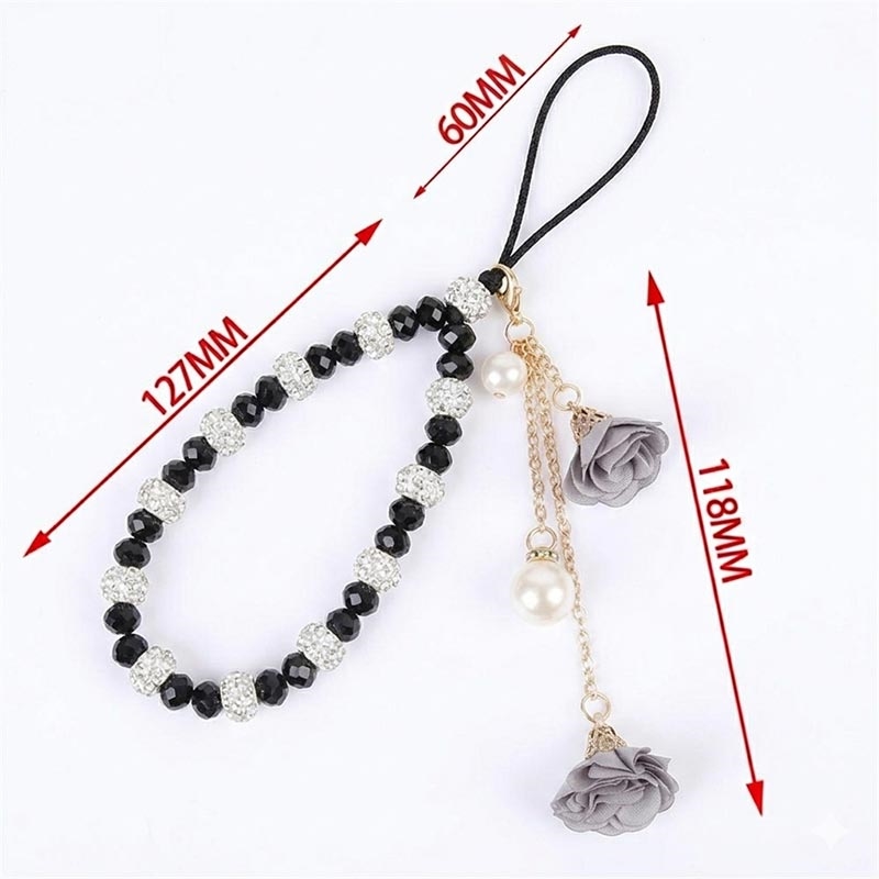 Geef je telefoon een elegante touch met dit 18,7 cm lange telefoonkoord met kristallen kralen. Het is ontworpen als zowel decoratief accessoire als praktische polsband en combineert kralen in kristalstijl, metalen accenten met strass-look, rozenbedeltjes en een hanger met imitatieparel voor een verfijnde alledaagse look.