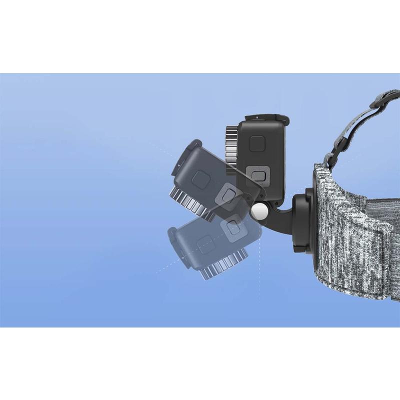 De hoofdband is ontworpen voor comfort en flexibiliteit, is verstelbaar voor een betere pasvorm en laat je de camera tot 180 graden kantelen om de juiste hoek te krijgen. Je kunt de bevestiging ook losmaken en aan de klep van een pet bevestigen voor alternatieve filmopstellingen. Dankzij de brede compatibiliteit werkt hij met veel actiecamera's en ondersteunt hij populaire modellen zoals GoPro en Osmo Action (voor sommige camera's is mogelijk een hoesje nodig).