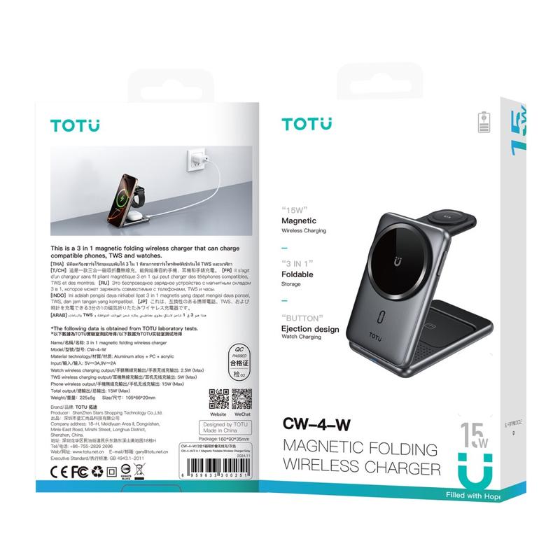 Het TOTU CW-4-W draadloze oplaadstation is een slanke en veelzijdige 3-in-1 oplaadoplossing voor je smartphone, smartwatch en oordopjes. Met een opvouwbaar magnetisch ontwerp, is het draagbaar en ruimtebesparend, waardoor het perfect is voor zowel thuis als op reis. Deze oplaadstandaard is gemaakt van eersteklas aluminiumlegering, PC en nitrilrubber en combineert duurzaamheid met moderne stijl. Ondersteunt tot 15W snel draadloos opladen voor smartphones, 5W voor oordopjes en 2,5W voor smartwatches, zodat al je essentiële apparaten snel en veilig opgeladen blijven.