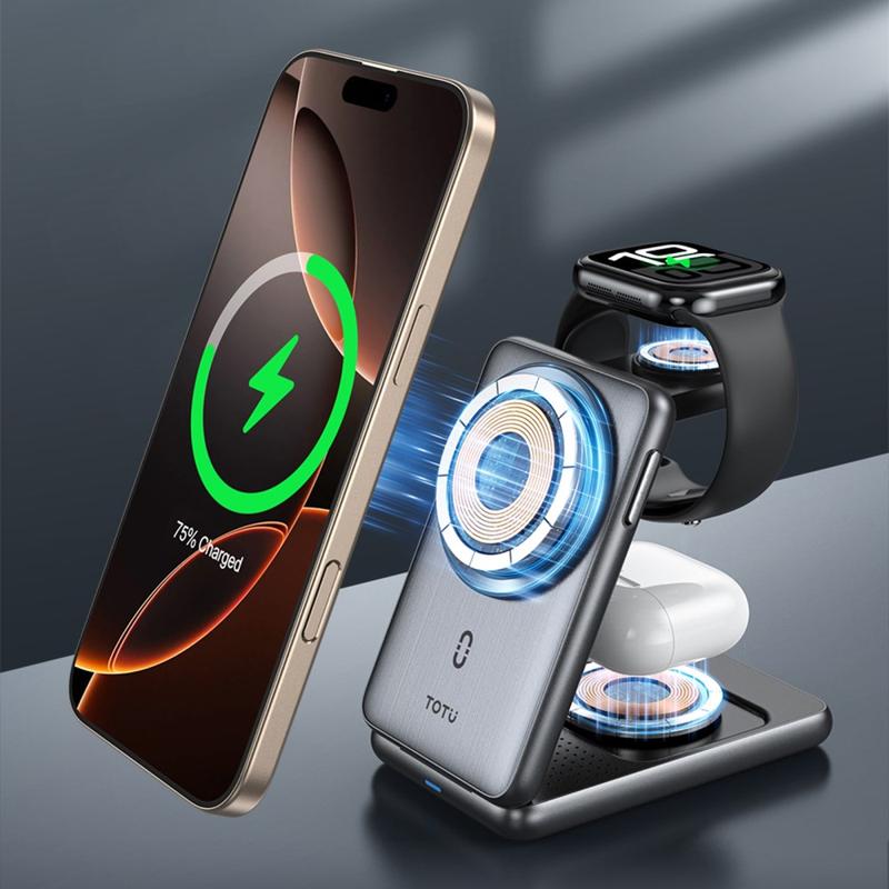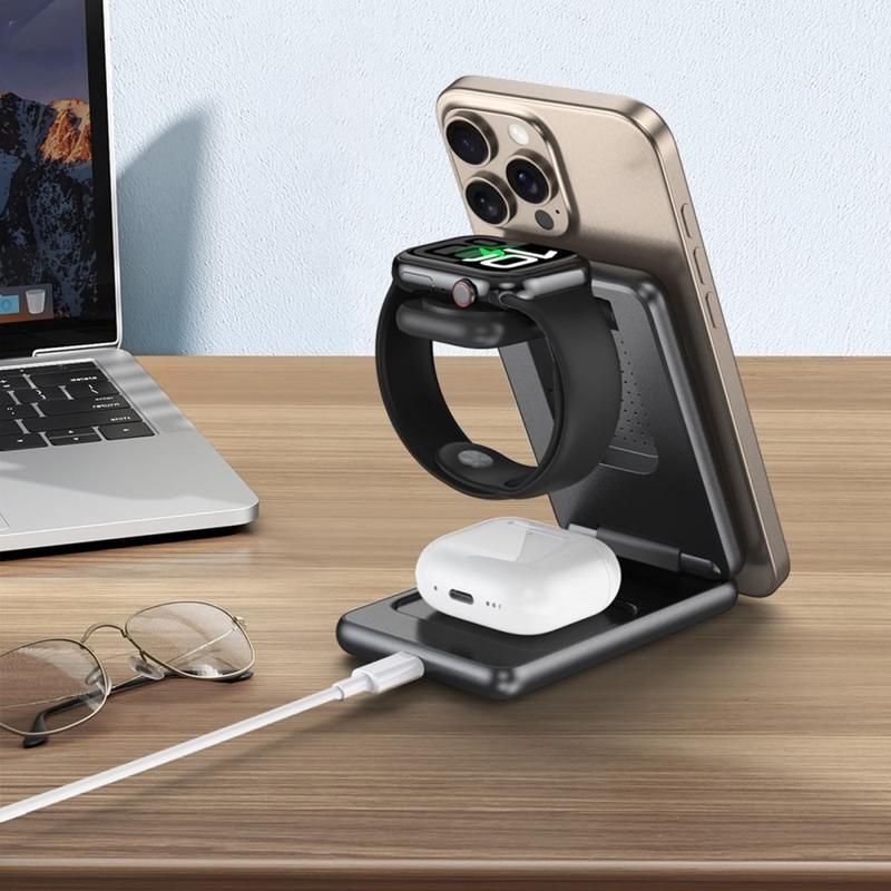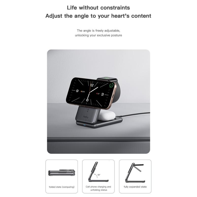 Totu CW-4-W 3-in-1 draadloos oplaadstation - magnetische opvouwbare oplaadstandaard voor telefoon, horloge en oordopjes - 15W snel opladen