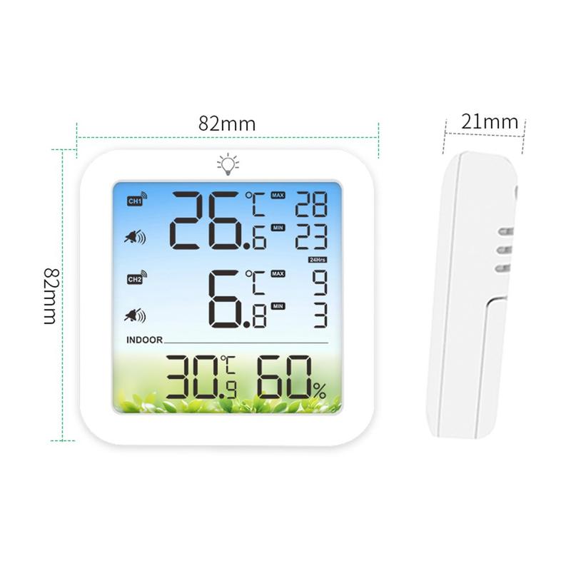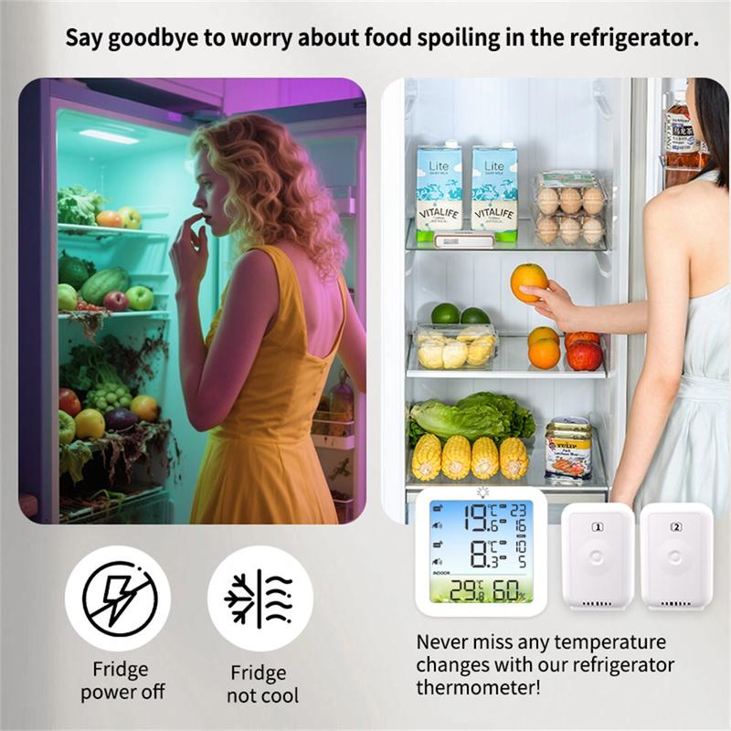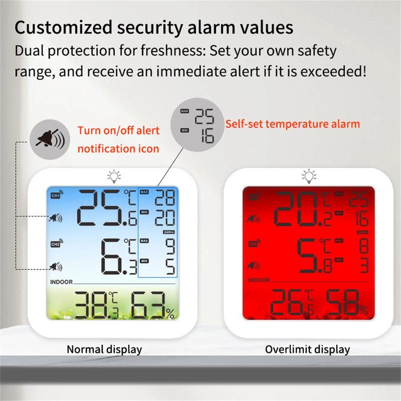 • TS-8082 Draadloze thermometer en hygrometer met twee kanalen - Temperatuurmonitor voor koelkast en vriezer met 2 sensoren en alarm