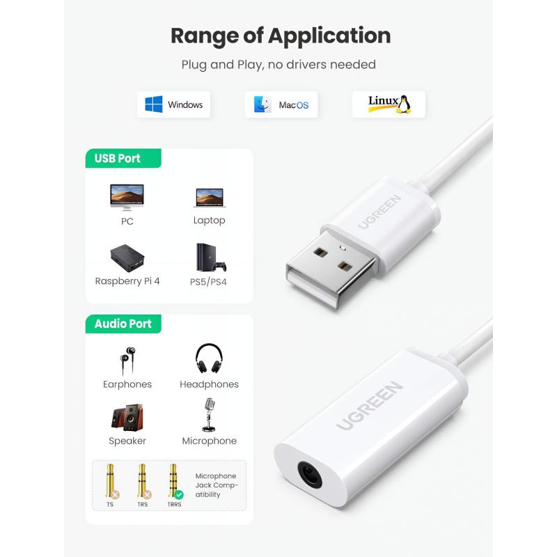 De UGREEN US206 USB-audioadapter voegt een 3.5mm TRRS-headsetverbinding toe aan apparaten die geen speciale audio-aansluiting hebben of een beschadigde poort hebben. Hij ondersteunt zowel audio-uitvoer als microfooningang via een enkele 3.5mm-connector, waardoor hij ideaal is voor headsets, online vergaderingen, gaming en dagelijkse communicatie. Met eenvoudige plug-and-play-bediening en brede systeemcompatibiliteit biedt hij een betrouwbare en handige audio-oplossing zonder extra stuurprogramma's.