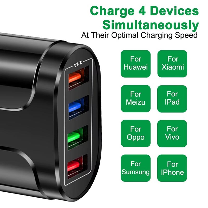 - Universal fast-charging USB charger with four ports and 48W power