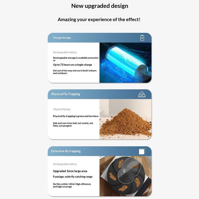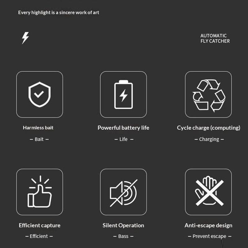Maak binnenruimtes aangenamer en hygiënischer met deze via USB oplaadbare, automatisch roterende vliegenvanger. Deze vliegenvanger voor huishoudelijk gebruik is ontworpen voor stil en praktisch dagelijks gebruik en maakt gebruik van een fysieke vangmethode met roterende zuigtechnologie om vliegende insecten te vangen zonder dat er sterke geuren of ingewikkelde installaties aan te pas komen. Het is een handige oplossing voor keukens, eetruimtes, cafés, ruimtes waar voedsel wordt bereid en andere binnenomgevingen waar vliegen hinderlijk kunnen zijn.
