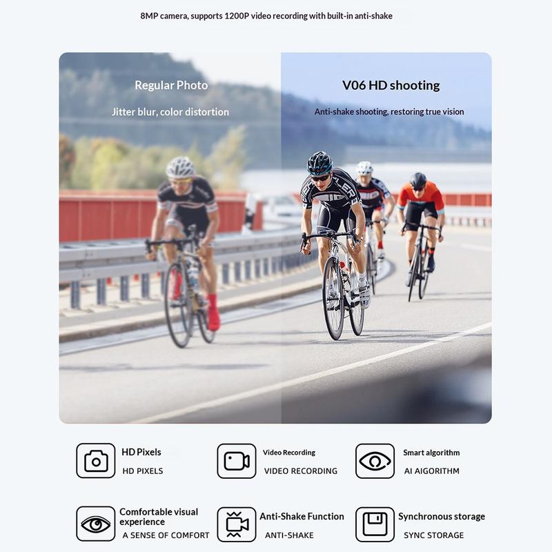 De V06 AI Smart Glasses combineren handsfree HD-opnames, weerbestendige duurzaamheid, stereogeluid en slimme spraakinteractie in één draagbaar apparaat – ideaal voor fietsers, reizigers en gebruikers die gemakkelijk video-opnames willen maken zonder extra apparatuur.