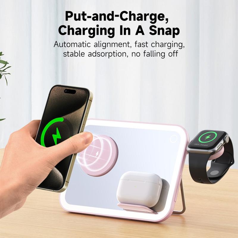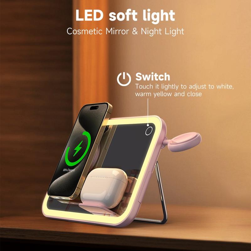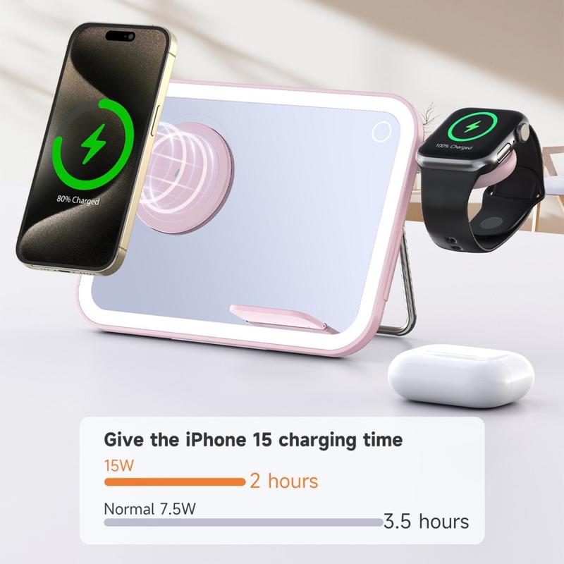 • V22 3-in-1 MagSafe draadloze oplader met LED make-upspiegel, nachtlampje - 10W/5W/3W