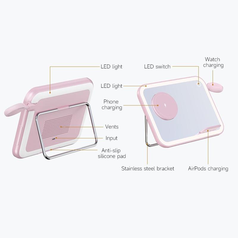 V22 3-in-1 MagSafe draadloze oplader met LED make-upspiegel, nachtlampje - Roze