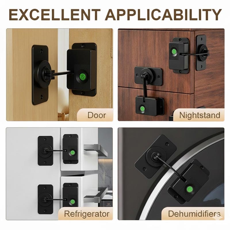 Het V86 kinderslot met vingerafdruk is ontworpen voor veelzijdige bescherming op verschillende huishoudelijke oppervlakken, zoals koelkasten, laden, nachtkastjes, kasten, ramen, wasmachines en archiefkasten. Met zowel zelfklevende installatie (niet boren) en schroefbevestigingsopties beschikbaar, past het zich gemakkelijk aan verschillende opstellingen aan.