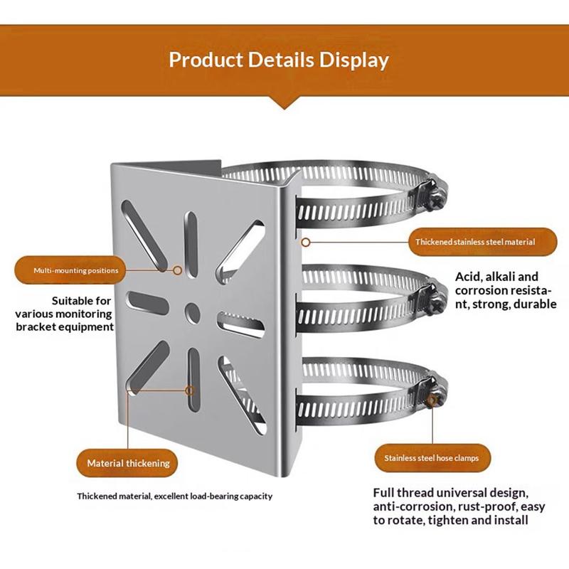 Vervaardigd van 201/304 roestvrij staal, biedt deze beugel uitstekende sterkte en weerstand tegen vervorming. De 2,0 mm dikke structuur verbetert het draagvermogen, waardoor hij geschikt is voor ondersteuning van een breed scala aan CCTV-cameramodellen.