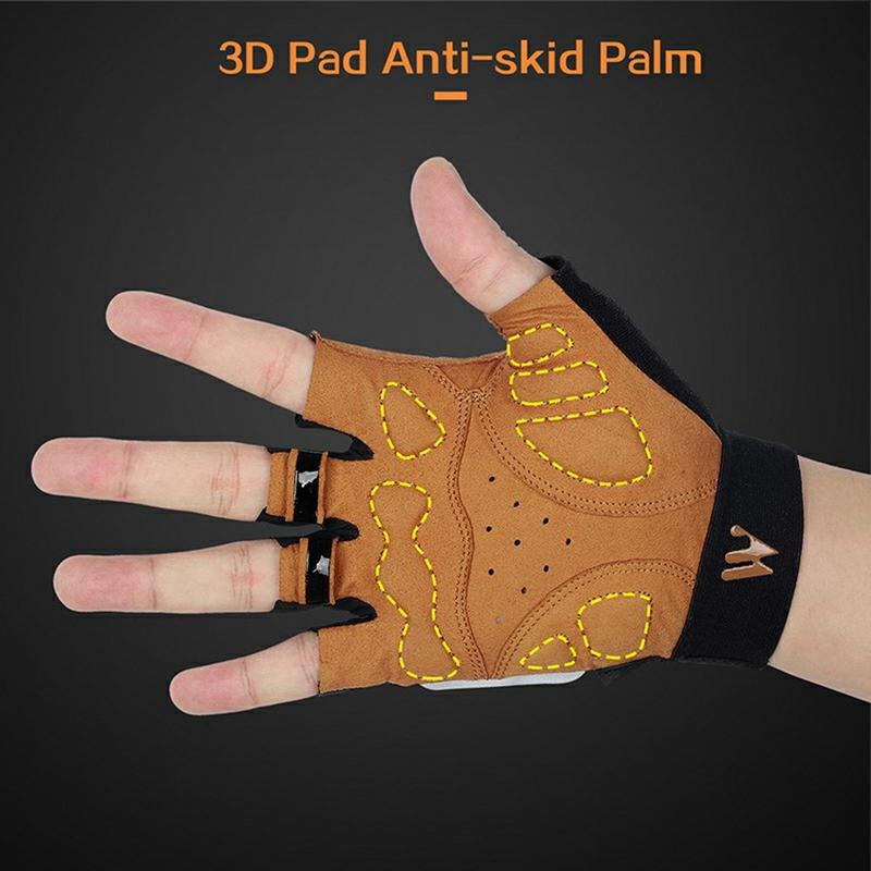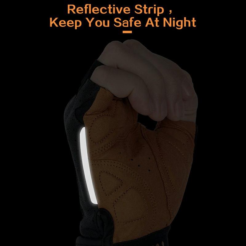 De handschoenen zijn ontworpen met het welzijn en de veiligheid van de rijder in gedachten en hebben zweetafvoerende badstof om snel je gezicht of voorhoofd af te vegen, samen met reflecterende elementen die de zichtbaarheid tijdens nachtelijke ritten vergroten. Het ergonomische ontwerp met halve vingers verbetert de controle, grip en ventilatie, ideaal voor langeafstandsfietsen, MTB, racefietsen en woon-werkverkeer.