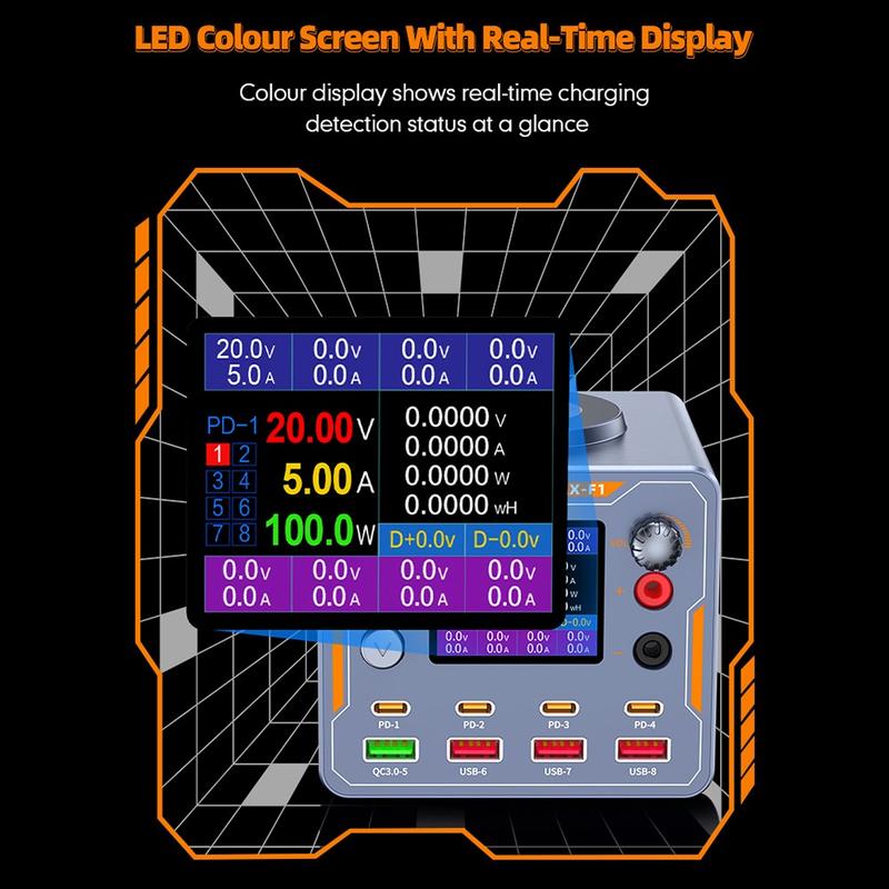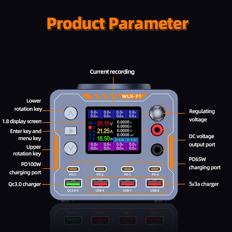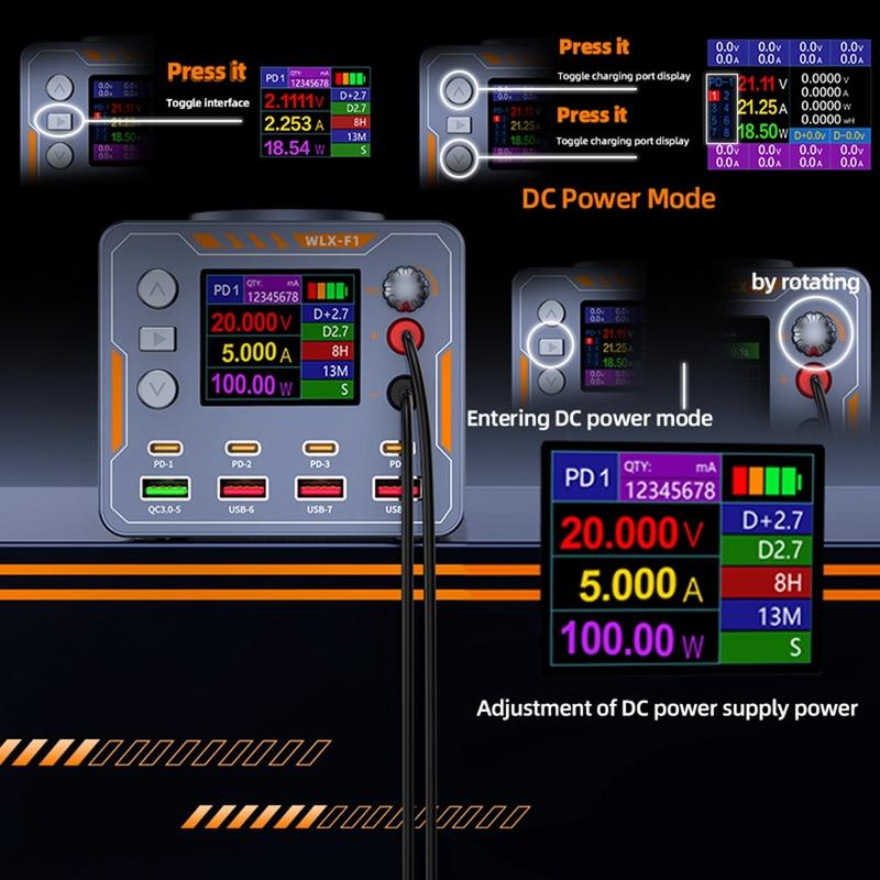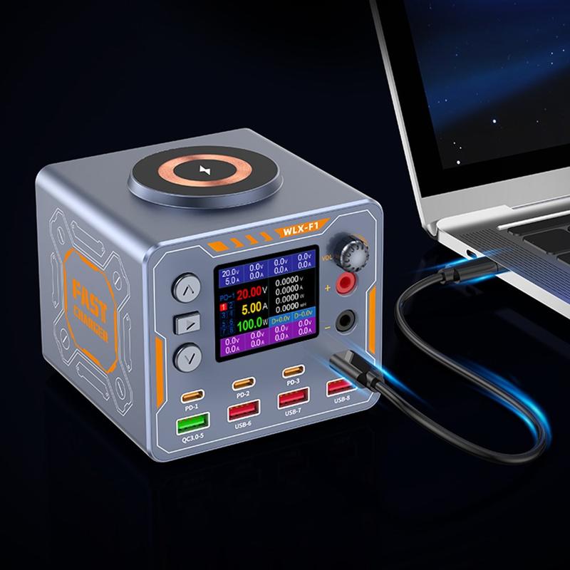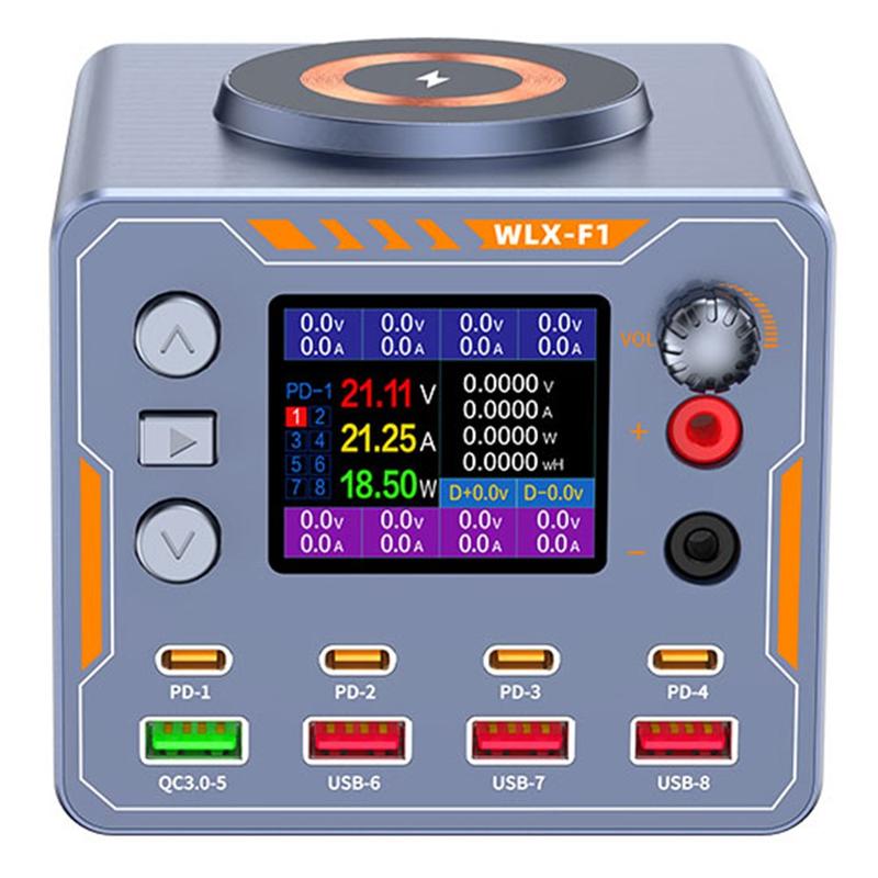 Met een vermogen tot 100 W op één poort voorziet de WLX-F1 apparaten met een hoge vraag, zoals MacBooks en USB-C laptops, op efficiënte wijze van stroom. Het apparaat heeft ook een instelbare precisie gelijkstroomuitgang (1,8-12 V, 2 A), waardoor het ideaal is voor het testen, repareren en diagnosticeren van elektronische apparatuur.