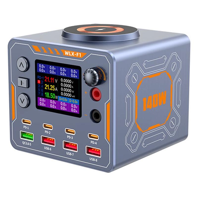 Het verbazingwekkende WLX-F1 140W oplaadstation voor meerdere apparaten is een krachtige en veelzijdige bureaulader die is ontworpen voor laptops, telefoons, tablets, wearables en zelfs elektronica-reparatie. Uitgerust met 8 oplaadopties, waaronder vier PD-snellaadpoorten, een QC3.0-poort, drie USB-poorten en een 15W draadloos oplaadpad, biedt het een complete oplaadoplossing voor thuis, op kantoor of in de werkplaats.