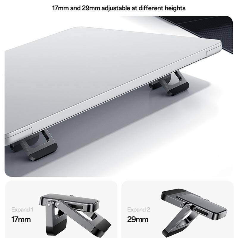 Verhoog het comfort en de luchtstroom tijdens het werken met de YESIDO LP11 laptopstandaardset. Deze ultradunne standaards, ontworpen als een compact paar opvouwbare steunen, worden aan de onderkant van uw laptop bevestigd en klappen snel uit tot een stabiele driehoekige steun. Door het apparaat iets te verhogen, zorgen ze voor een betere luchtstroom onder de laptop en verbeteren ze tegelijkertijd de kijkhoek, wat zorgt voor comfortabeler typen en een betere schermpositie.