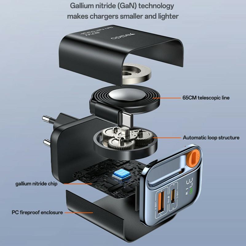 Yesido YC100 67W snelle oplader met intrekbare Type-C kabel - USB-A en USB-C GaN oplaadadapter - EU-stekker