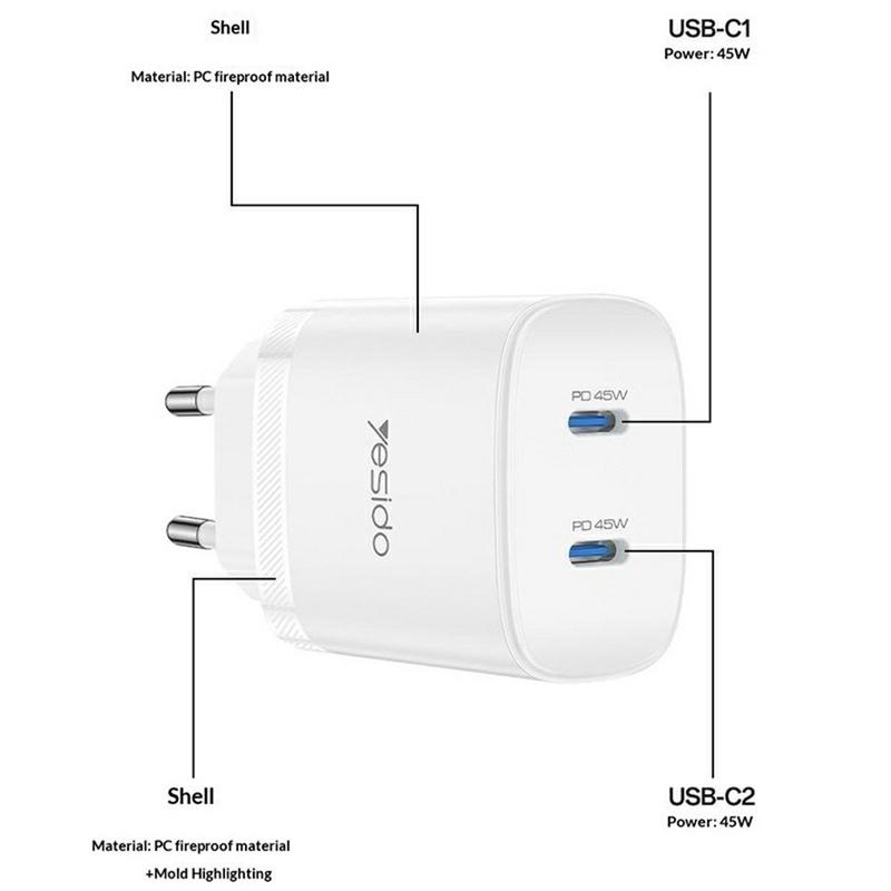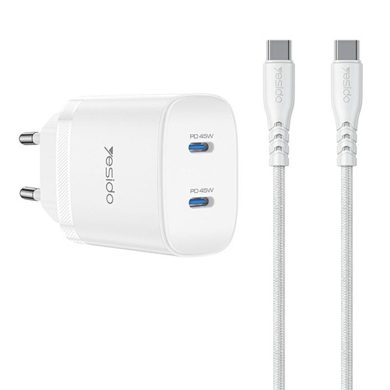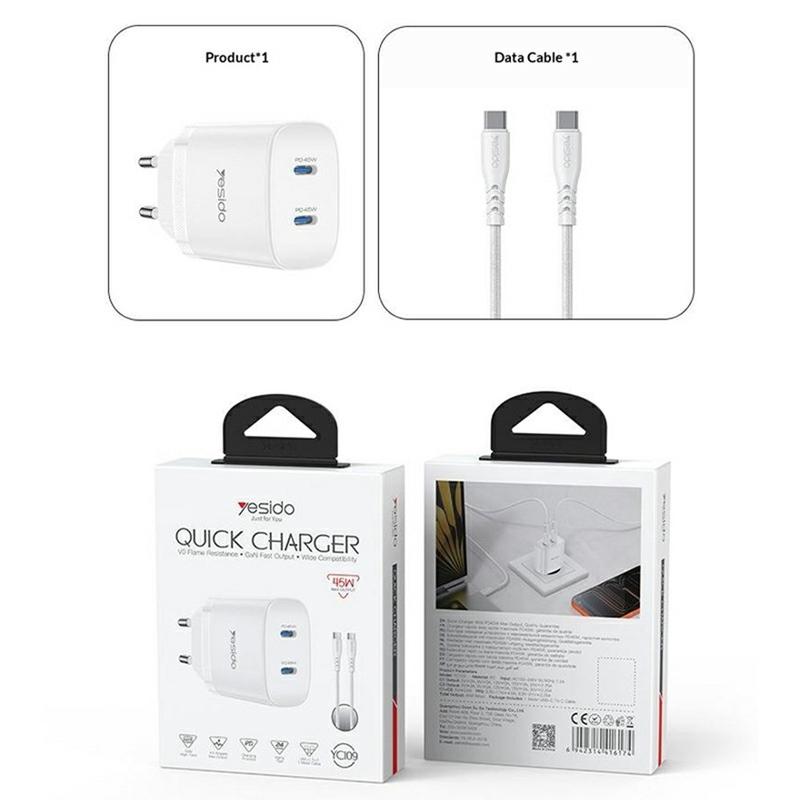 Yesido YC109 45W dubbele USB-C PD-oplader met USB-C-kabel - snellaadadapter voor wandcontactdoos