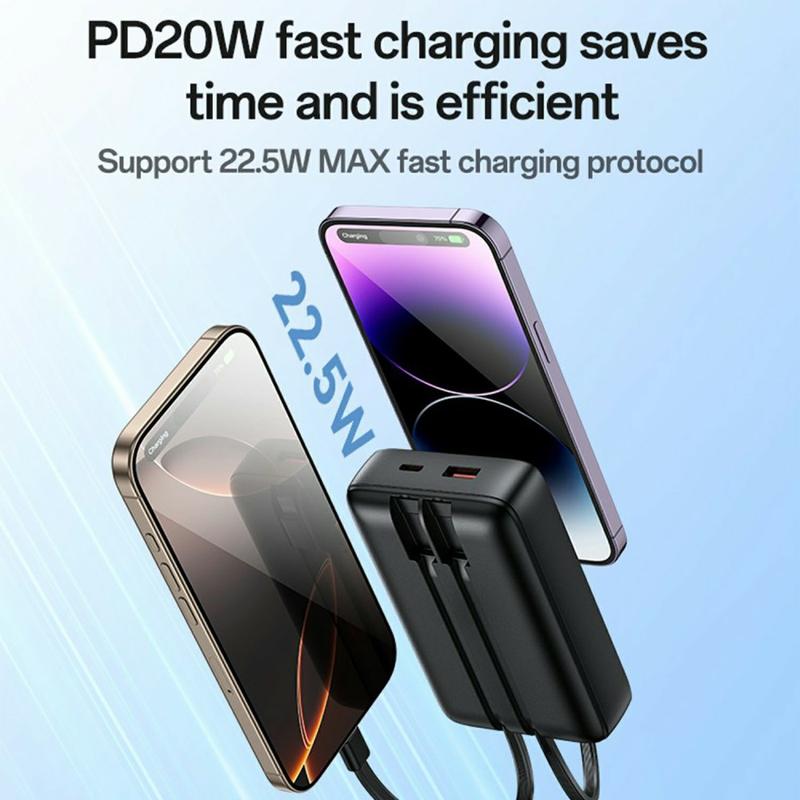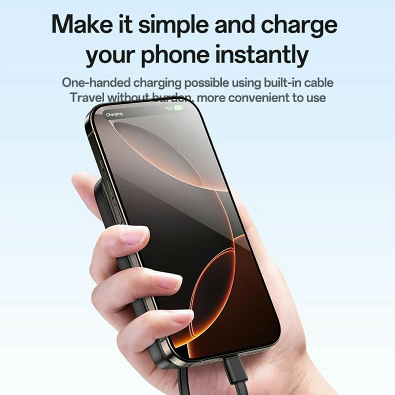 - Ingebouwde kabels: Geïntegreerde Type-C en Lightning (Lightning-compatibele) kabels zorgen ervoor dat je altijd klaar bent om op te laden zonder extra accessoires.