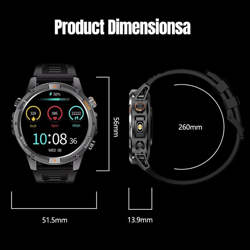 Het horloge is ontworpen voor avonturen in de buitenlucht en heeft een ingebouwde zaklamp, GPS-positionering en een digitaal kompas, zodat je vol vertrouwen over paden kunt navigeren en je routes kunt volgen. De 580 mAh batterij met hoge capaciteit biedt langdurige prestaties en levert tot 40 dagen stand-by tijd en ongeveer 7 dagen normaal gebruik. Met een IP68 waterdichtheid is hij bestand tegen regen, spatten en zwemmen zonder zorgen.