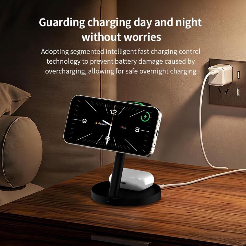 Deze oplader is een geweldige optie als je een eenvoudigere en overzichtelijkere oplaadroutine wilt. In plaats van met verschillende losse opladers en kabels te werken, kun je je meest gebruikte apparaten bij elkaar houden in één compacte standaard. Het magnetische ontwerp maakt het opladen van je telefoon eenvoudiger, de verstelbare houders verbeteren het dagelijks gebruiksgemak en het nachtlampje zorgt voor extra comfort zonder extra ruimte in te nemen.